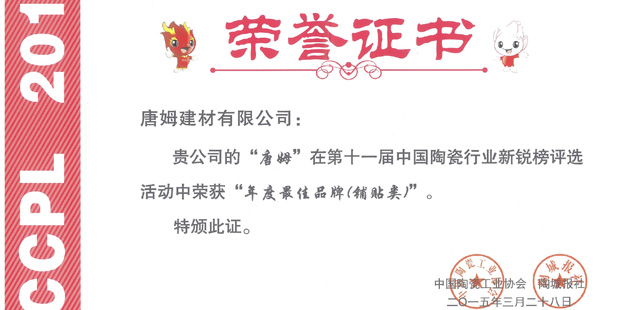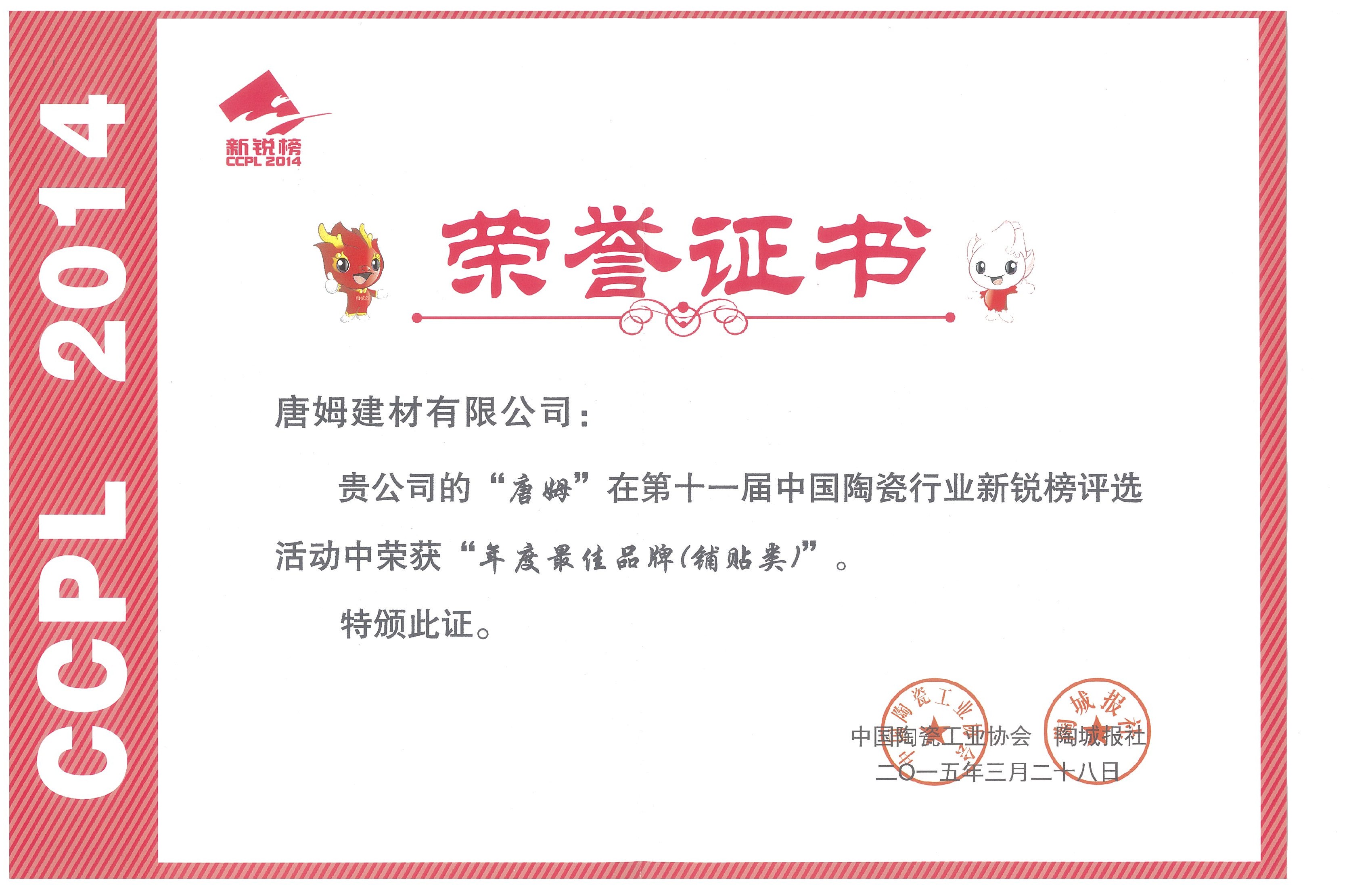 同時(shí),還曾先后獲得“全國(guó)房地產(chǎn)總工建筑設(shè)計(jì)造型優(yōu)選品牌”、”2014年度用戶(hù)關(guān)注產(chǎn)品獎(jiǎng)“、”2014中國(guó)瓷磚鑲貼體系十大最具影響力品牌“、”2014中國(guó)陶瓷行業(yè)新銳榜年度品牌“及”2014中國(guó)陶瓷行業(yè)新銳榜年度產(chǎn)品“等眾多獎(jiǎng)項(xiàng)。積極參與”華叔杯“裝飾鑲貼技能大賽、”閩龍杯“最強(qiáng)瓦工挑戰(zhàn)賽等行業(yè)活動(dòng),為助推行業(yè)發(fā)展貢獻(xiàn)力量。