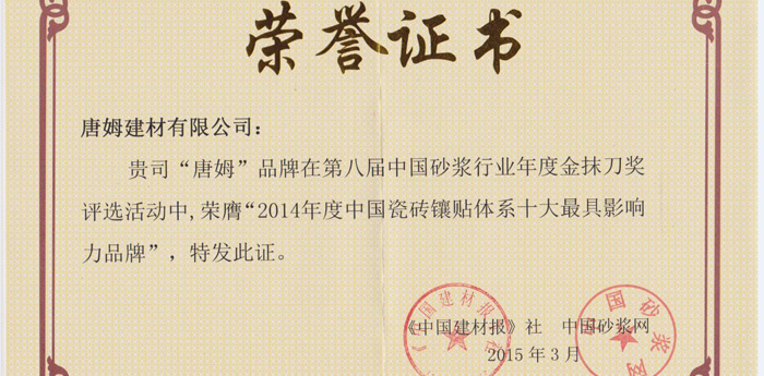 唐姆品牌先后參與制定了中華人民共和國(guó)陶瓷墻地磚膠粘劑行業(yè)標(biāo)準(zhǔn)JC/T547-2005和中華人民共和國(guó)陶瓷墻地磚填縫劑行業(yè)標(biāo)準(zhǔn)JC/T1004-2006,天然石材用水泥基膠粘劑JG/T355-2012,《建筑裝飾裝修工程質(zhì)量驗(yàn)收規(guī)范》GB50210,《外墻飾面磚工程施工及驗(yàn)收規(guī)程》JGJ126,《室內(nèi)建筑裝飾石材工程技術(shù)應(yīng)用規(guī)程》、《干混砂漿生產(chǎn)線(xiàn)設(shè)計(jì)規(guī)范》等、并于2006年9月推出了一款專(zhuān)門(mén)適用于中國(guó);u粘貼的“905玻化磚粘結(jié)劑”等相關(guān)產(chǎn)品。2014年10月,唐姆瓷磚粘結(jié)劑產(chǎn)品成功通過(guò)國(guó)家綠色建筑選用產(chǎn)品商標(biāo)認(rèn)證。